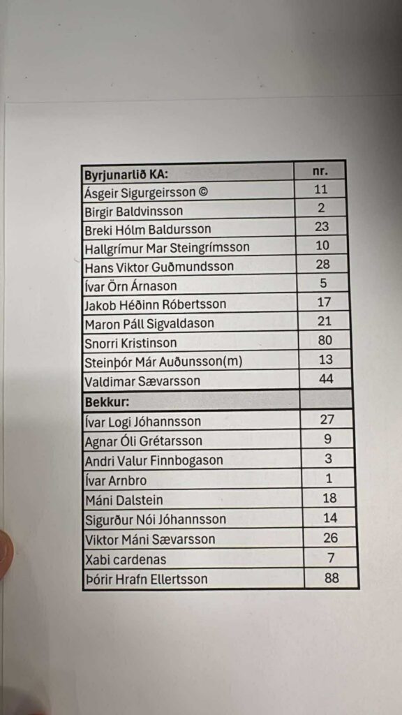 Skiptingar KA 46 mínúta (hálfleikur) Hans Viktor Guðmundsson, út Þórir Hrafn Ellertsson, inn 55 mínúta Maron Páll Sigvaldason, út Máni Dalstein, inn 63 mínúta Ívar Örn Árnason, út Ásgeir Sigurgeirsson, út Agnar Óli Grétarsson, inn Sigurður Nói Jóhannsson, inn 69 mínúta Valdimar Logi Sævarsson, út Snorri Kristinsson, út Xabi Cardenas, inn Ívar Logi Jóhannsson, inn 87 mínúta Jakob Héðinn Róbertsson, út Andri Valur Jakobsson, inn