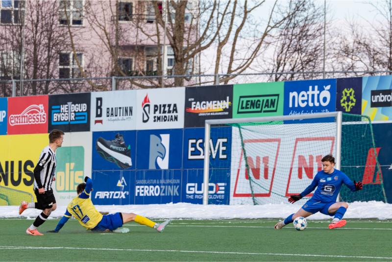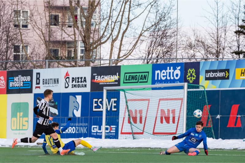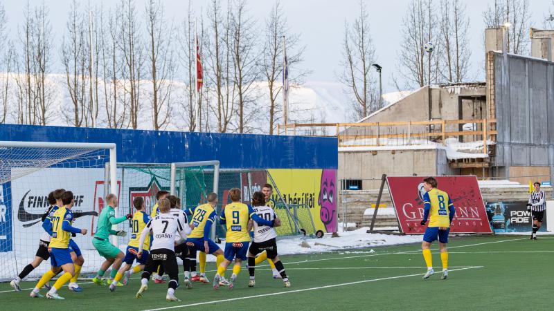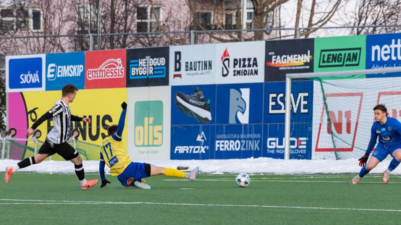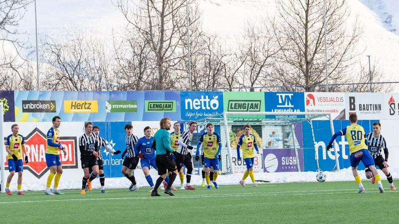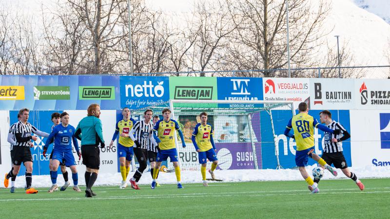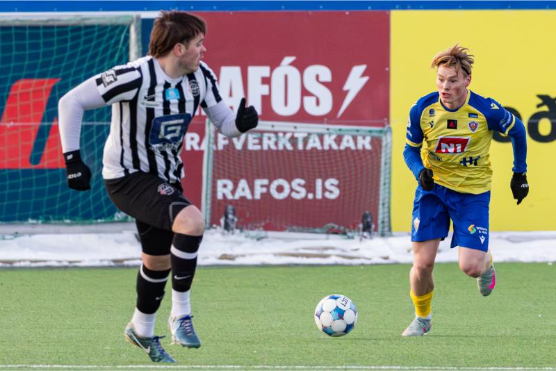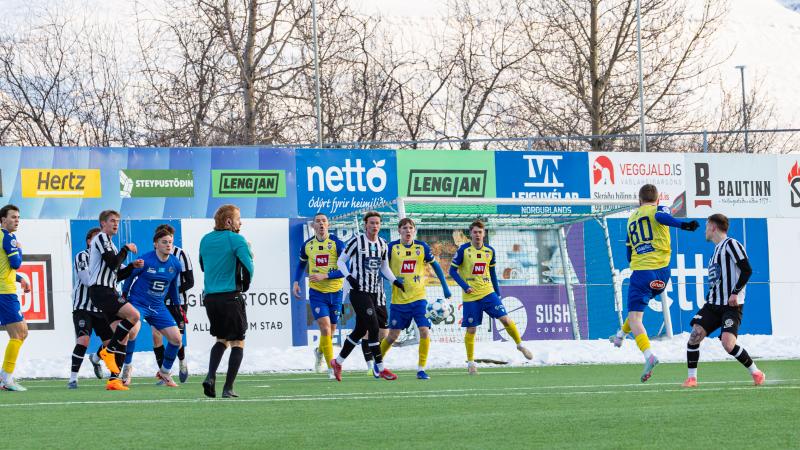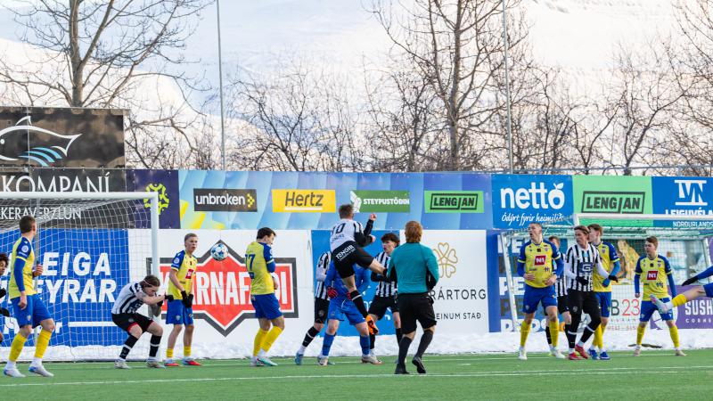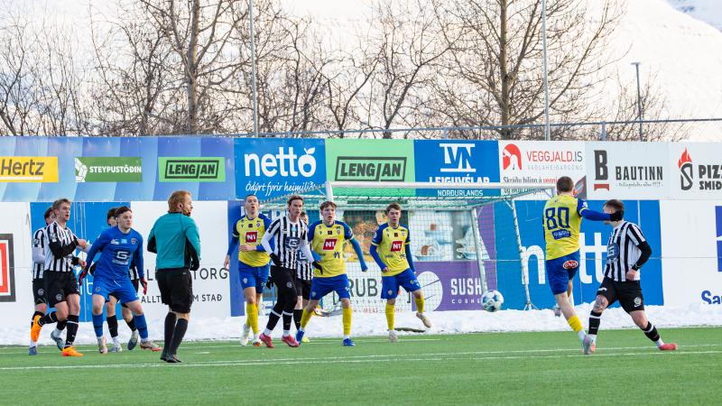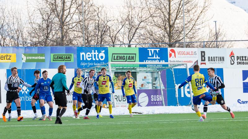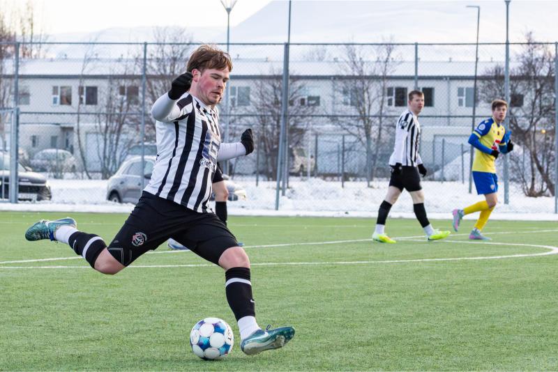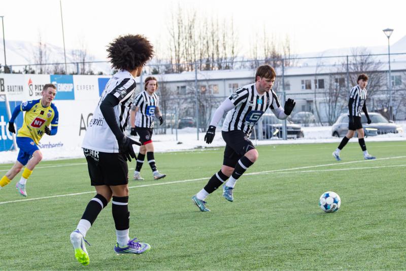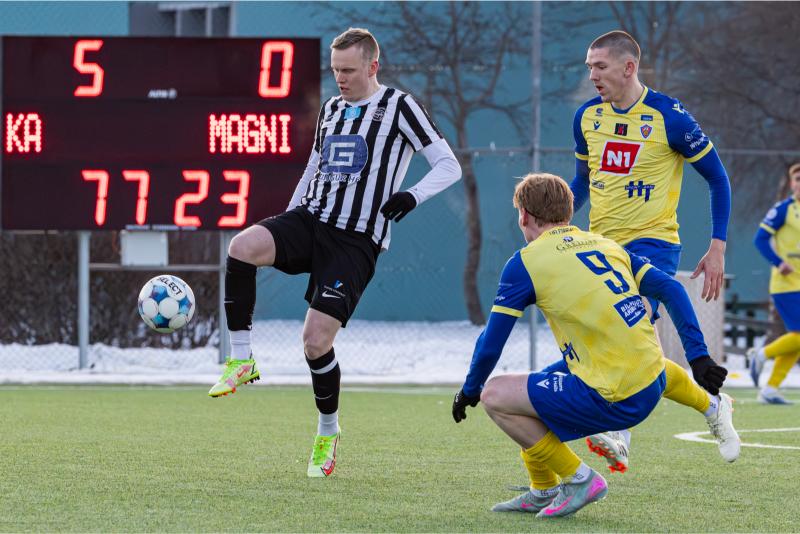 KA tryggði sér sæti í úrslitum A-deildar Kjarnafæðimótsins með öruggum 5–0 sigri á Magna þegar liðin mættust á Greifavellinum í gær. Leikið var í kulda, en undir fyrstu sól ársins sem setti skemmtilegan svip á leikinn.