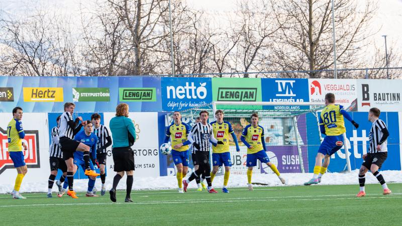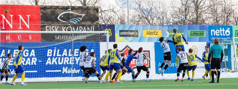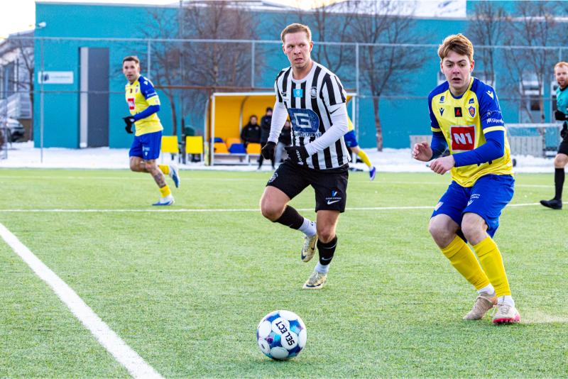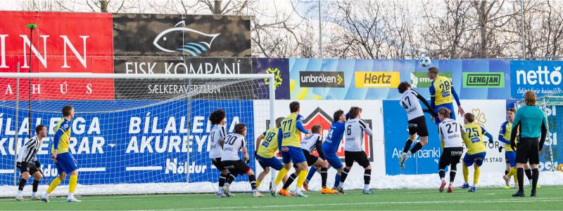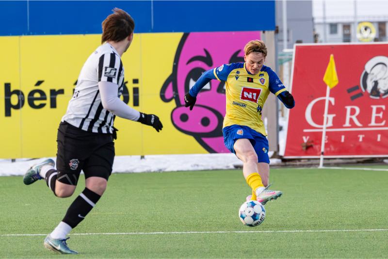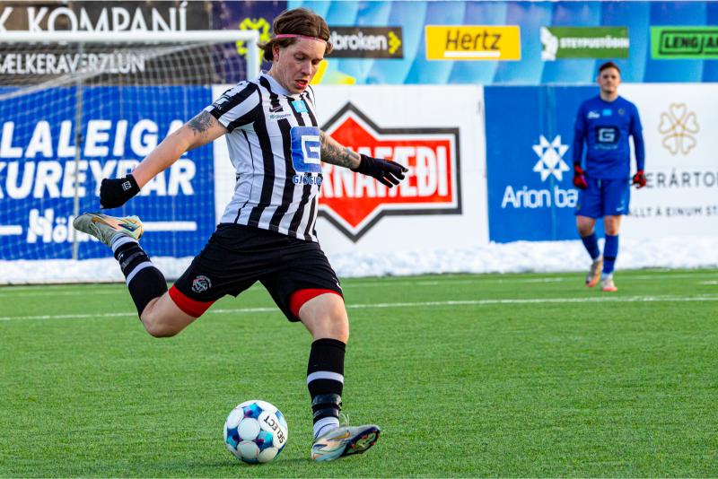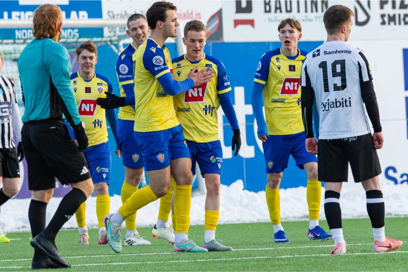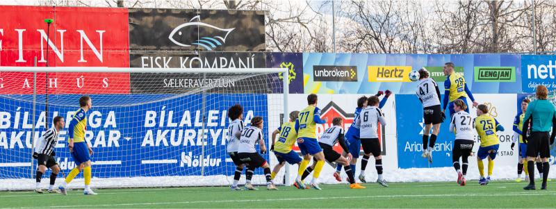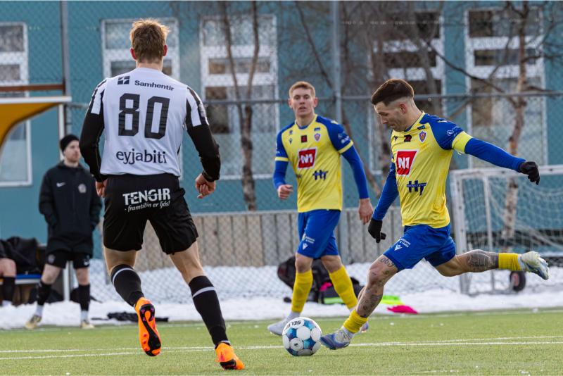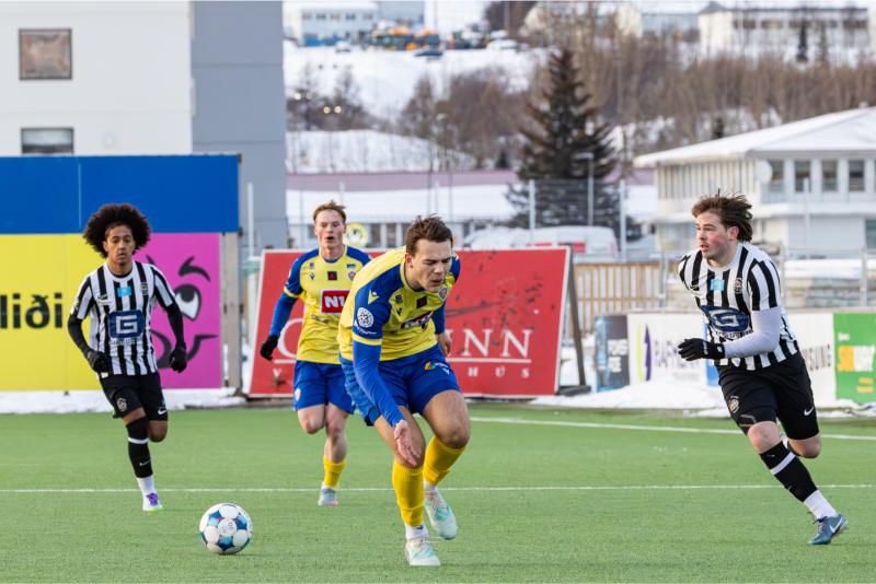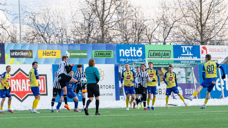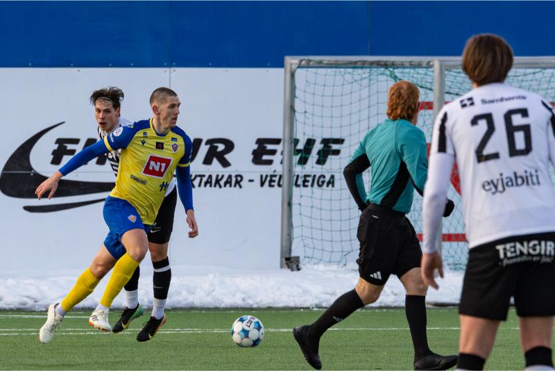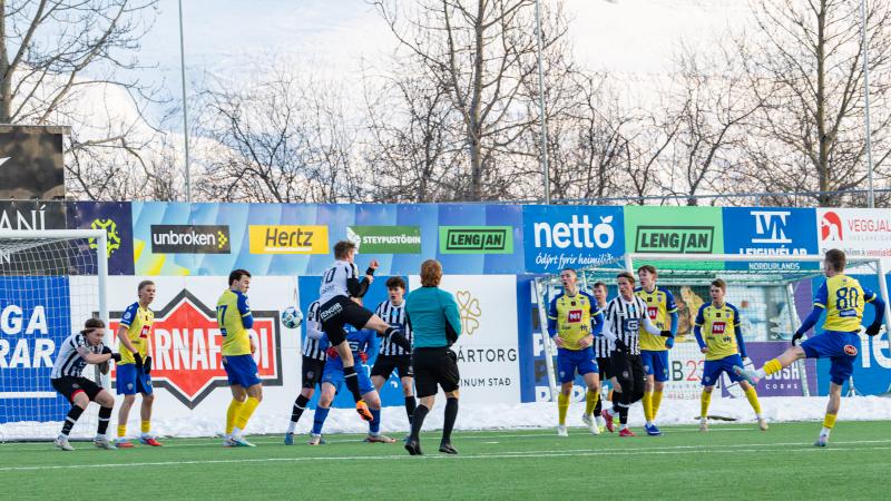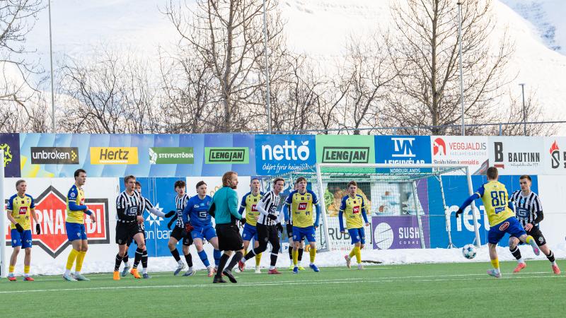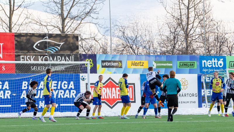 KA tryggði sér sæti í úrslitum A-deildar Kjarnafæðimótsins með öruggum 5–0 sigri á Magna þegar liðin mættust á Greifavellinum í gær. Leikið var í kulda, en undir fyrstu sól ársins sem setti skemmtilegan svip á leikinn.