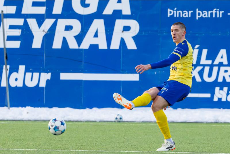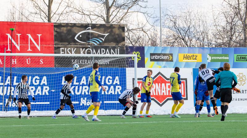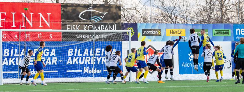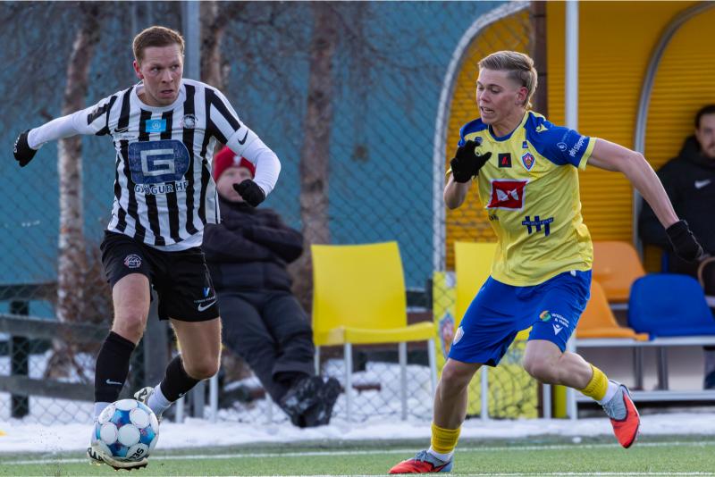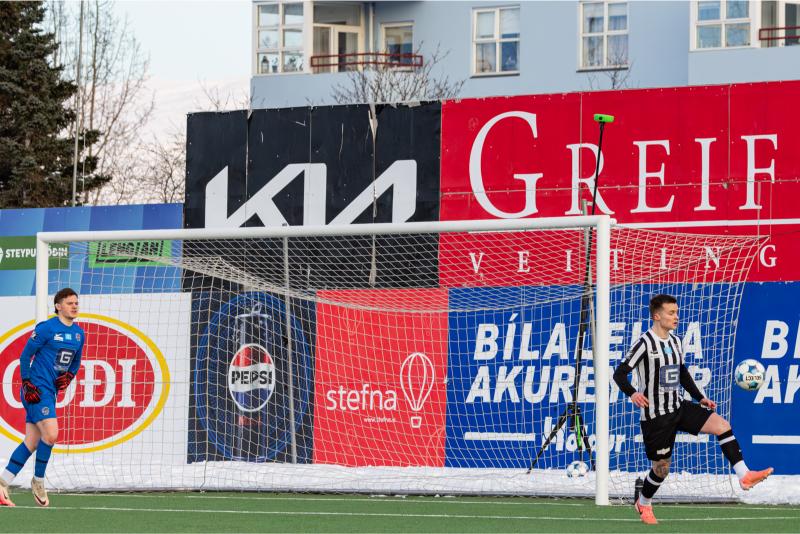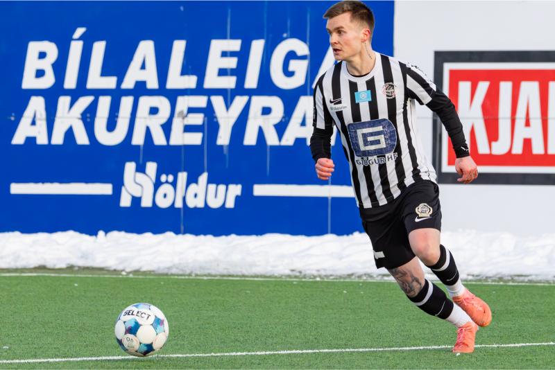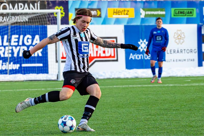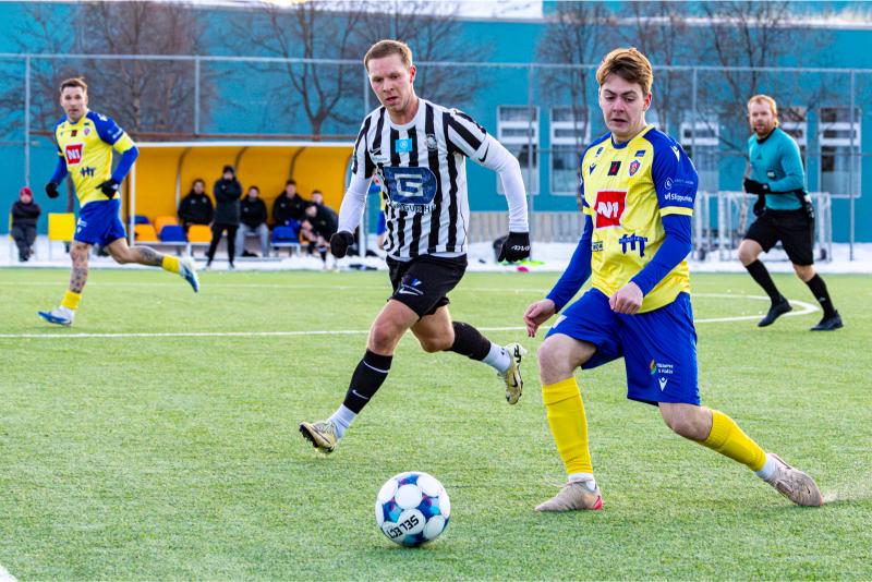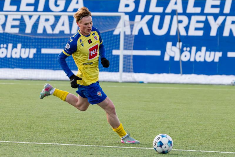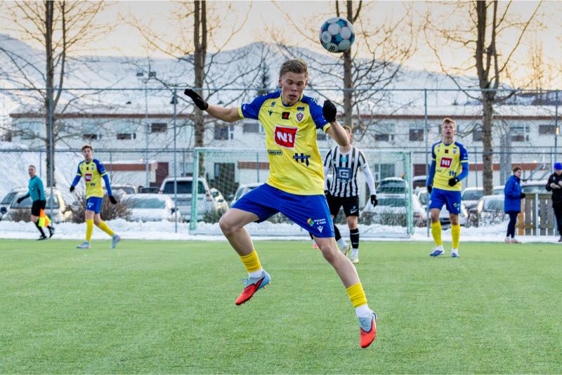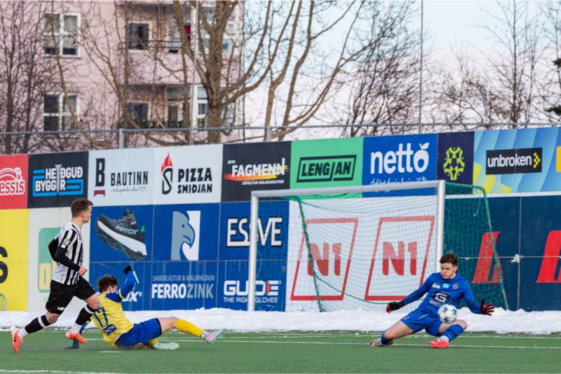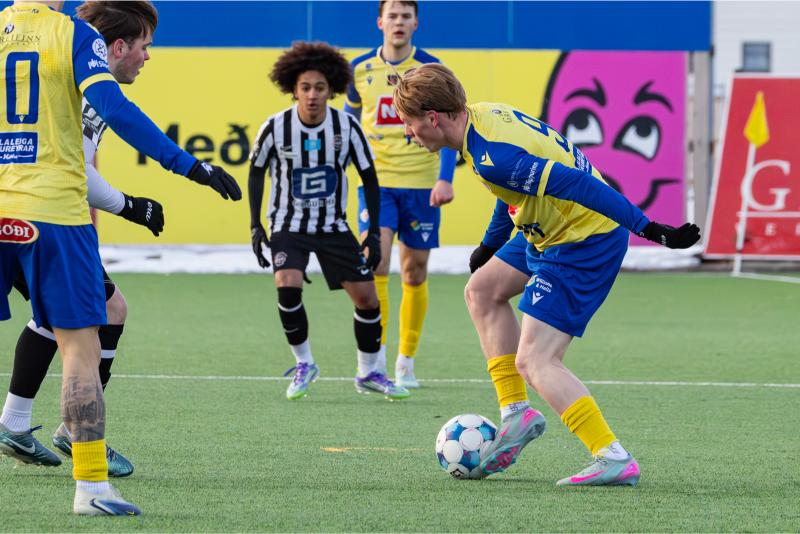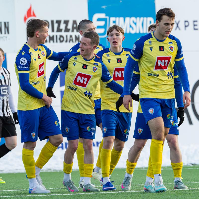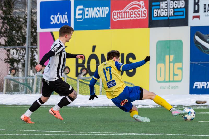 KA tryggði sér sæti í úrslitum A-deildar Kjarnafæðimótsins með öruggum 5–0 sigri á Magna þegar liðin mættust á Greifavellinum í gær. Leikið var í kulda, en undir fyrstu sól ársins sem setti skemmtilegan svip á leikinn.